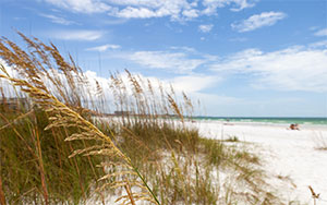 Sea Oats on the white sands of a South Florida beach with blue sky and puffy clouds.
