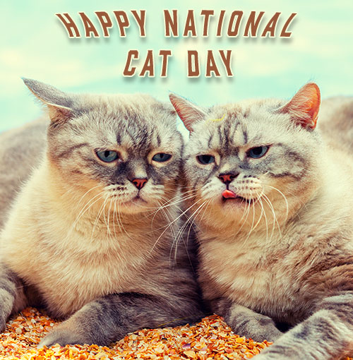 A picture of two cats resting with Happy National Cat Day. This image and many of the others are sized for social media sites such as Facebook. |