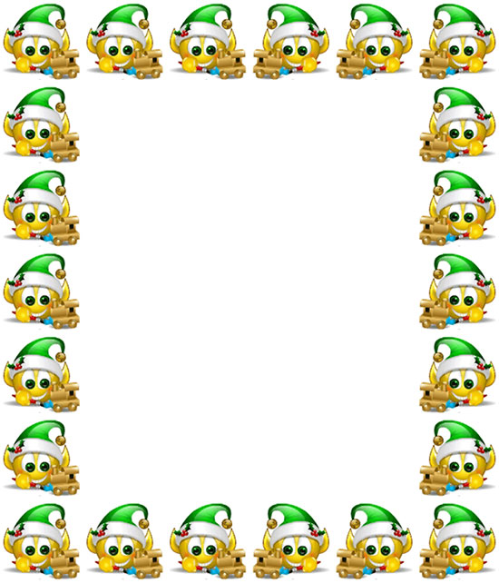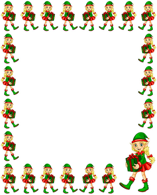 Borders and frames include Christmas flowers, boy and girl elves, checking the list, Santa's mail, funny elves with Merry Christmas and dancing elves.